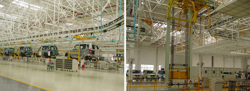 The system is mainly composed of the following three parts: the paint body line, the interior decoration line and the chassis line. After painting, the body conveyor line is mainly used for storing and transporting the painted body. The wire body adopts a sliding conveyor, and the rotating roller bed of the painting workshop sends the assembled body after the paint to the double-chain conveyor on the gallery. . The body is stored and transported on the porch, positioned on the tumbling roller, and the body is transferred to the rotating gurney by the hydraulic lifting fork transplanter, and the body is dropped to the inner decorative line by the fork type transplanting elevator. On the device. The inner decorative line adopts a type of conveyor, and the body of the paint is conveyed by the follow-up device to the body after the paint, and then the body behind the interior is sent to the chassis line. The chassis line includes: chassis assembly line, door assembly line, wheel assembly line, instrument panel distribution line, front suspension distribution line, rear suspension distribution line, engine distribution line, seat assembly line, final assembly line, and so on. The control system adopts five sets of sub-control system. The system controls the rear body conveyor line and realizes the transfer lifting device. The system 2 controls the interior door line and the instrument distribution line. The system three controls the chassis, tire, seat line and engine. And front and rear suspension line; system four controls the final assembly line, body transfer and OK line; system five controls the appearance inspection line.