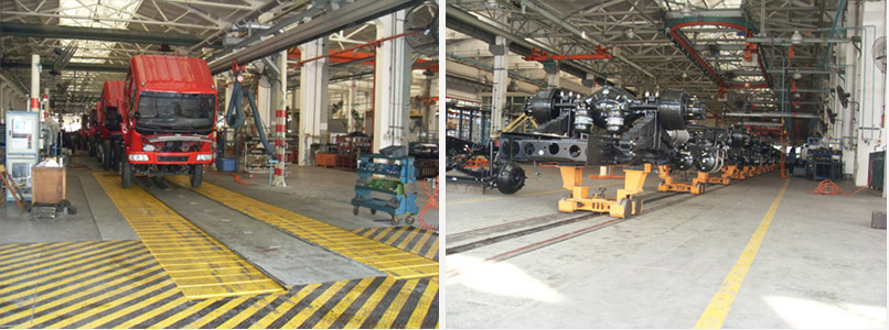 The vertical line of the first-line auxiliary line adopts the structure of the standard plate type traction chain with platen, mainly consists of the driving device, the transmission shaft assembly, the tensioning shaft assembly, the intermediate bracket, the frame support trolley, the head frame assembly, and the tailstock. The assembly and the like are independent of the control part of the first line main line, and no interlock function is provided. The production line has a total of 14 stations, each station has a three-color display light, and there are buttons and one on each of the left and right sides. There are three buttons for emergency stop, help and missing, and the button box is arranged along the line. The system is equipped with a large-screen display for real-time synchronous display of on-site data transmission in the workshop. The display content is “year plan, monthly plan, current production cumulative output, etc.” The display content can be stored, the output is automatically accumulated, and the computer background management is supported. The support trolleys of the first-line secondary line are mutually common with the previous production lines, and are numbered one by one to form a mark.