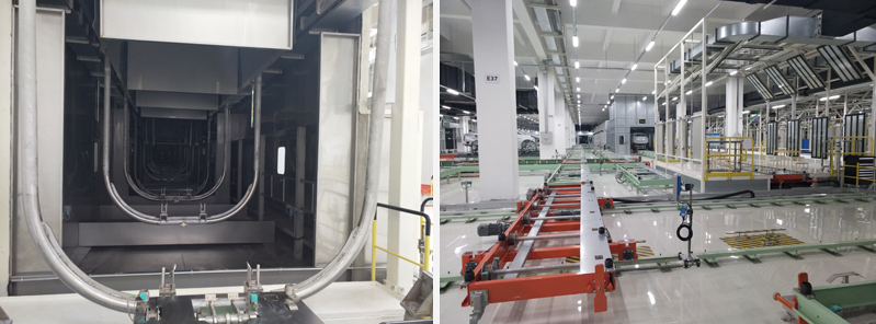 Conveyor line form: pre-treatment, electrophoresis is the swing rod conveyor line; the other is the sled conveyor line