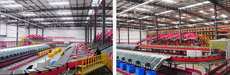 VIPSHOP cross-belt intelligent sorting system covers an area of 1000 square meters, with the sorting efficiency of more than 20,000 pieces per hour. It is an advanced sorting system integrating machinery, electricity and software, which is composed of package delivery line, stack belt distribution system, supply platform, the main line of cross belt intelligent sorting system, sorting grid, and automatic warehouse system etc. The cross-belt intelligent sorting system has the advantages of small area coverage, high sorting efficiency and less labor input. It is the best choice for large-scale production warehouse distribution center, e-commerce company and express delivery company to enhance the competitiveness, reduce labor costs and improve warehouse distribution efficiency.