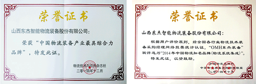 “OMH Dong Jie equipment”is rated as “2014 China logistics well-known pand (logistics system integration)" by China logistics pand network and China logistics equipment purchasing managers' union. In December 2014, obtained Chinese logistics equipment industry's most comprehensive pand certificates issued by the magazine of Logistics technology and application.