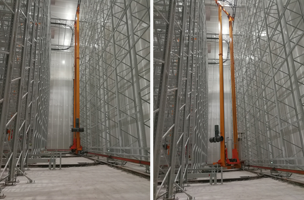 道岔堆垛機在傳統堆垛機的形式上,增加了轉軌機構自動切換運行軌道,適用于單臺堆垛機服務多個巷道或n臺堆垛及運行于m個巷道(堆垛機臺數n可遠小于巷道數m)。
