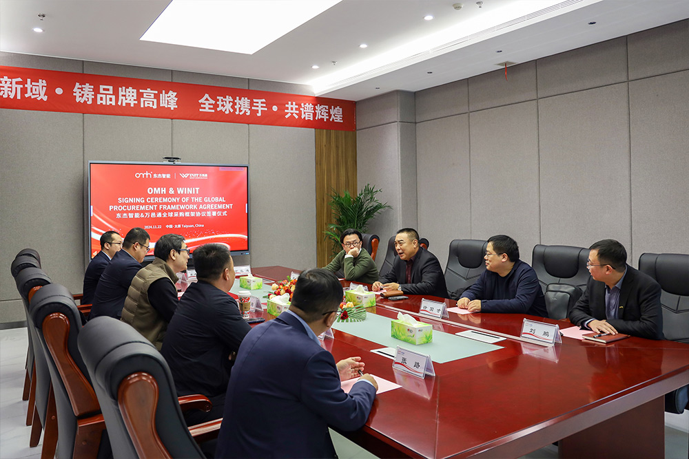 2024年11月22日,東杰智能&萬邑通全球采購框架協議簽署儀式在東杰智能總部成功舉行,合同總金額近7億元。儀式由東杰智能副總裁郭強忠主持,出席儀式的有:萬邑通董事長兼CEO陳宏偉、信息總經理徐國才,東杰智能董事長婁剛、總裁王振國、董事長助理陳晨、財務總監張路、副總裁劉鵬。此次協議的簽署,標志著雙方在全球物流領域的合作邁向新高度。
